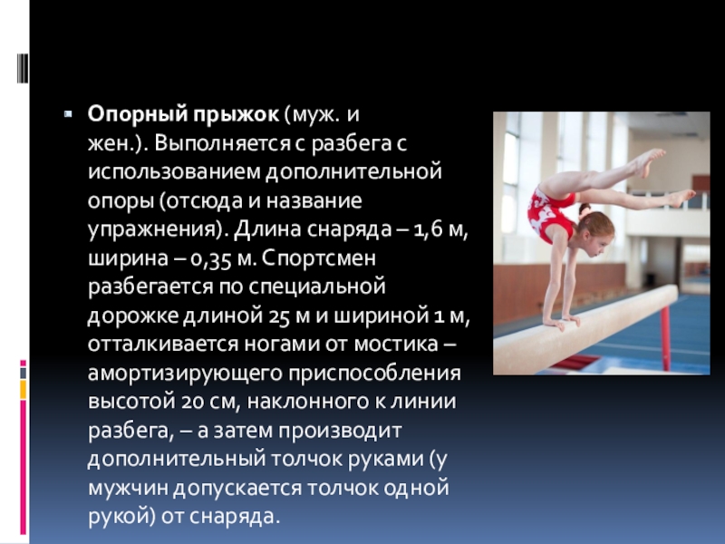 Слайд 8Опорный прыжок (муж. и жен.). Выполняется с разбега с использованием дополнительной опоры (отсюда
