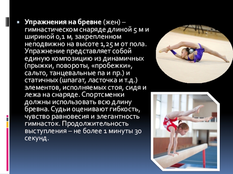Слайд 9Упражнения на бревне (жен) – гимнастическом снаряде длиной 5 м и шириной 0,1