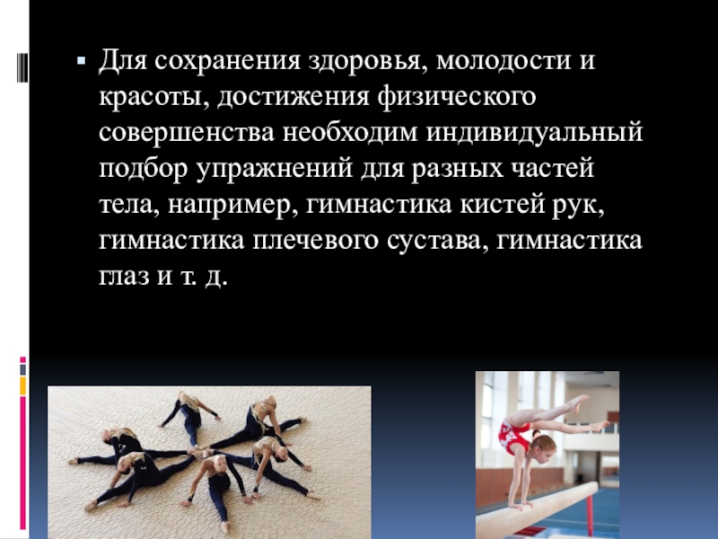 Слайд 4Для сохранения здоровья, молодости и красоты, достижения физического совершенства необходим индивидуальный