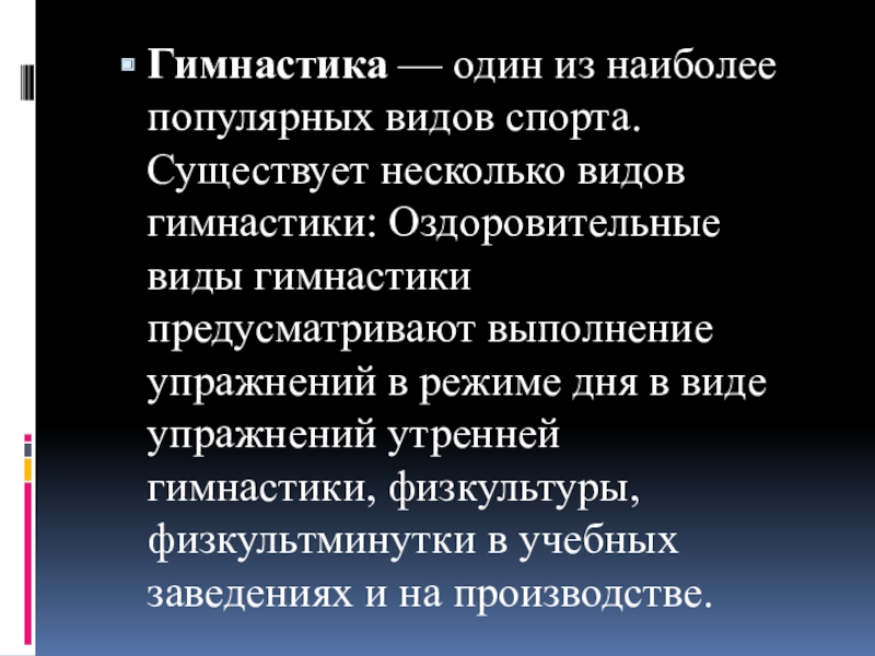 Слайд 6Гимнастика — один из наиболее популярных видов спорта. Существует несколько видов гимнастики: Оздоровительные