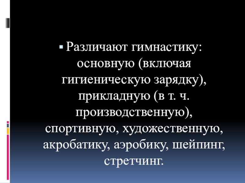 Различают гимнастику: основную (включая гигиеническую зарядку), прикладную (в т. ч. производственную),