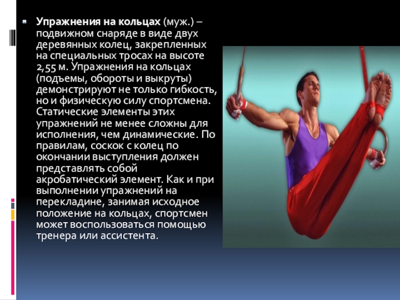Слайд 12Упражнения на кольцах (муж.) – подвижном снаряде в виде двух деревянных колец,