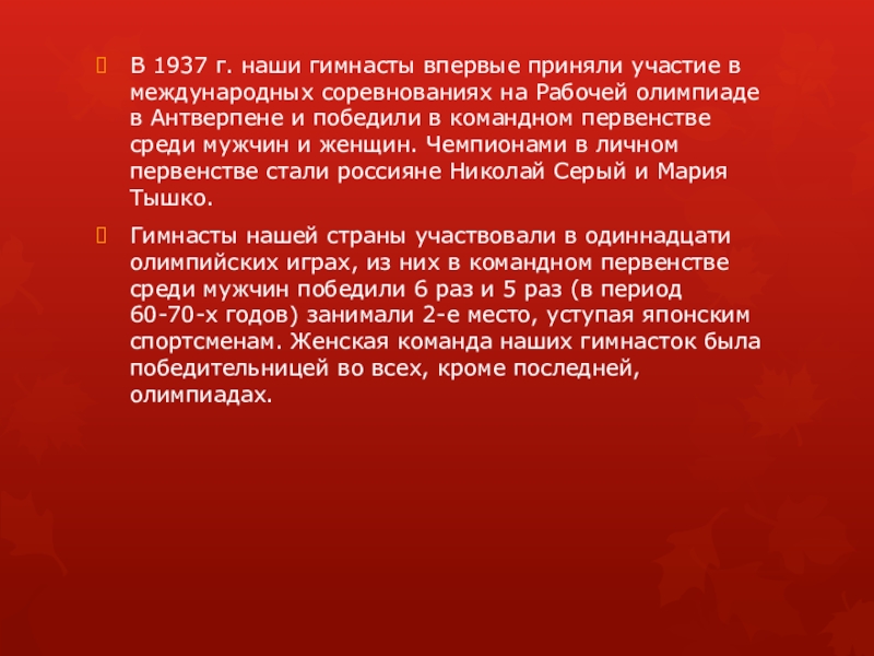 В 1937 г. наши гимнасты впервые приняли участие в международных соревнованиях на Рабочей олимпиаде в Антверпене и
