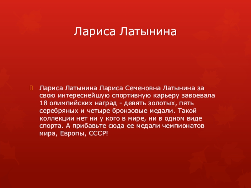 Лариса ЛатынинаЛариса Латынина Лариса Семеновна Латынина за свою интереснейшую спортивную карьеру завоевала 18 олимпийских наград - девять