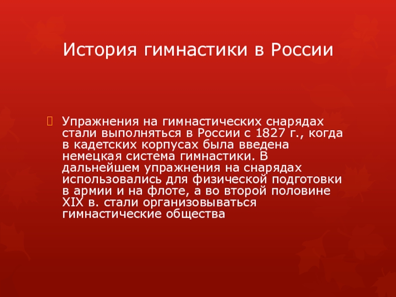 с 1827 г., когда в кадетских корпусах была введена немецкая система гимнастики. В дальнейшем упражнения на снарядах использовались для физической подготовки в армии и на флоте, а во второй половине XIX в. стали организовываться гимнастические общества