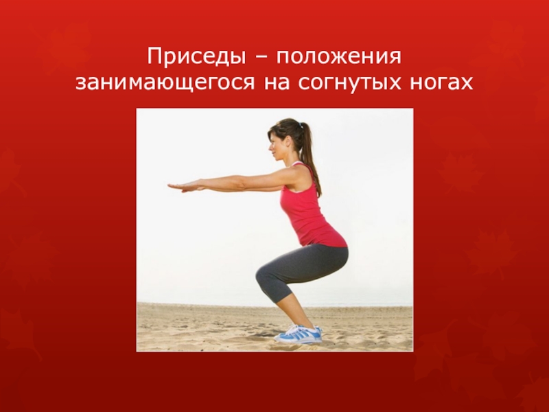 Слайд 4Приседы – положения занимающегося на согнутых ногах