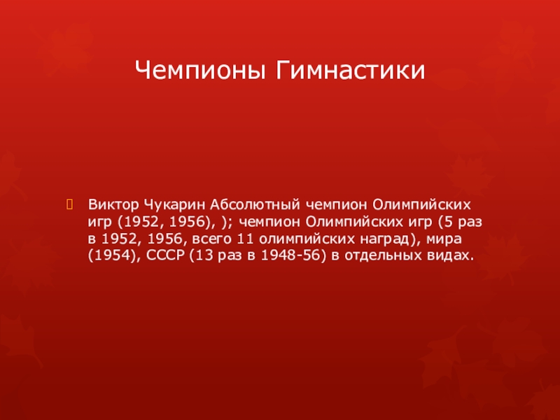 Чемпионы ГимнастикиВиктор Чукарин Абсолютный чемпион Олимпийских игр (1952, 1956), ); чемпион Олимпийских игр (5 раз в 1952,