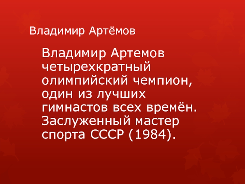 Владимир АртёмовВладимир Артемов четырехкратный олимпийский чемпион, один из лучших гимнастов всех времён. Заслуженный мастер спорта СССР (1984).