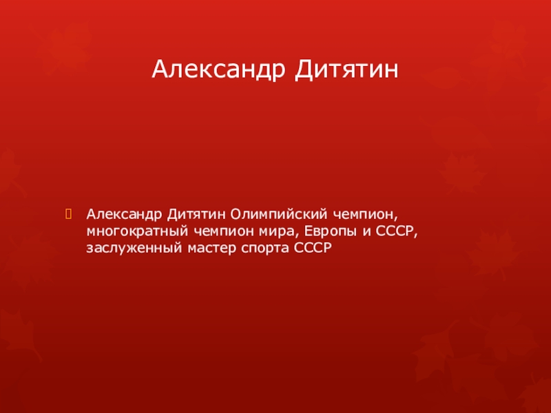 Александр ДитятинАлександр Дитятин Олимпийский чемпион, многократный чемпион мира, Европы и СССР, заслуженный мастер спорта СССР