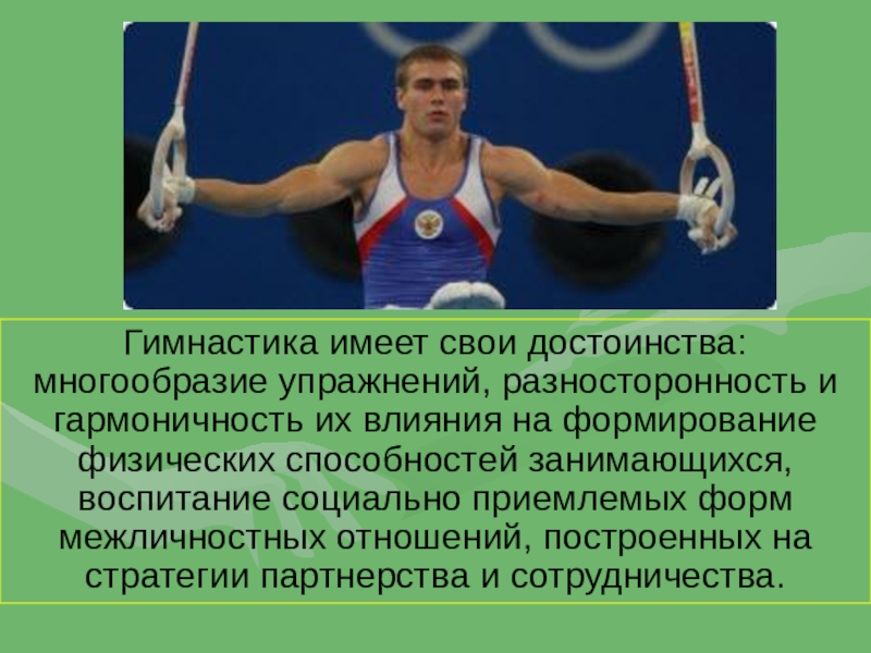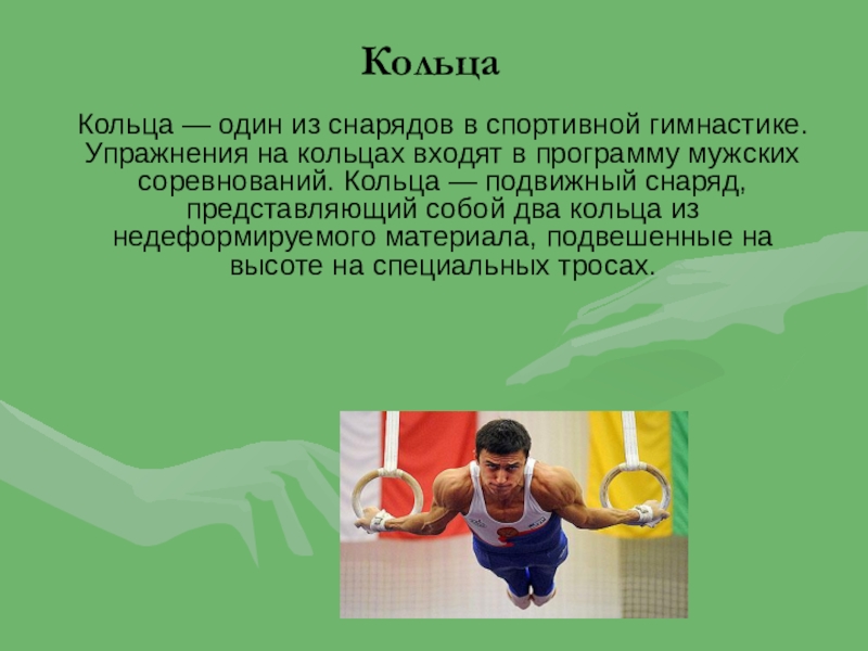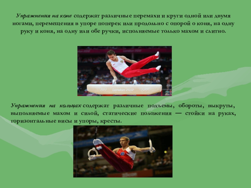 Упражнения на кольцах содержат различные подъемы, обороты, выкруты, выполняемые махом и силой, статические положения — стойки на руках, горизонтальные висы и упоры, кресты.