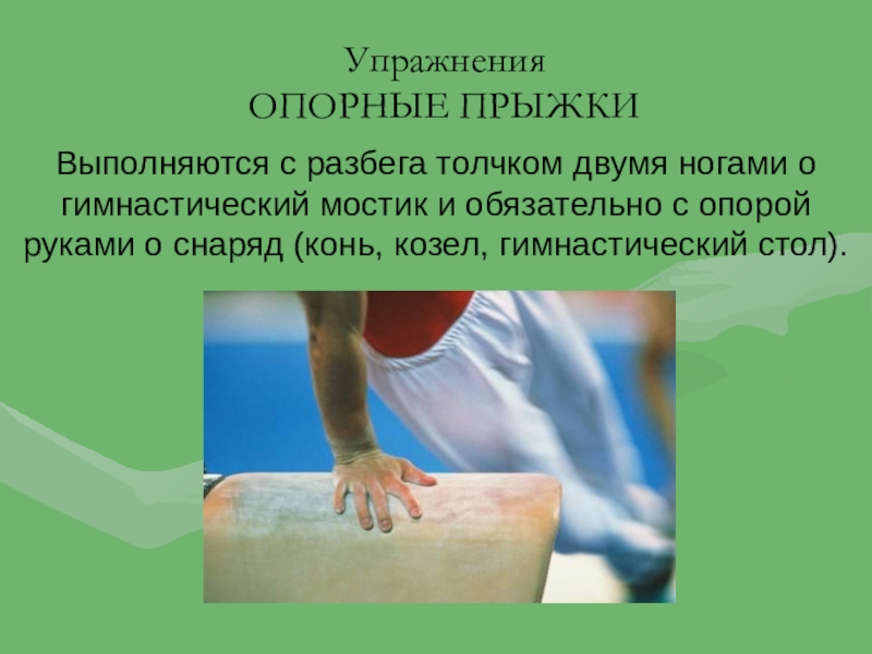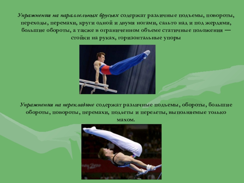 Упражнения на перекладине содержат различные подъемы, обороты, большие обороты, повороты, перемахи, подлеты и перелеты, выполняемые только махом.