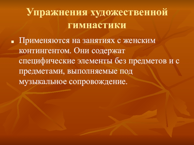 Упражнения художественной гимнастикиПрименяются на занятиях с женским контингентом. Они содержат специфические элементы без предметов и с предметами,