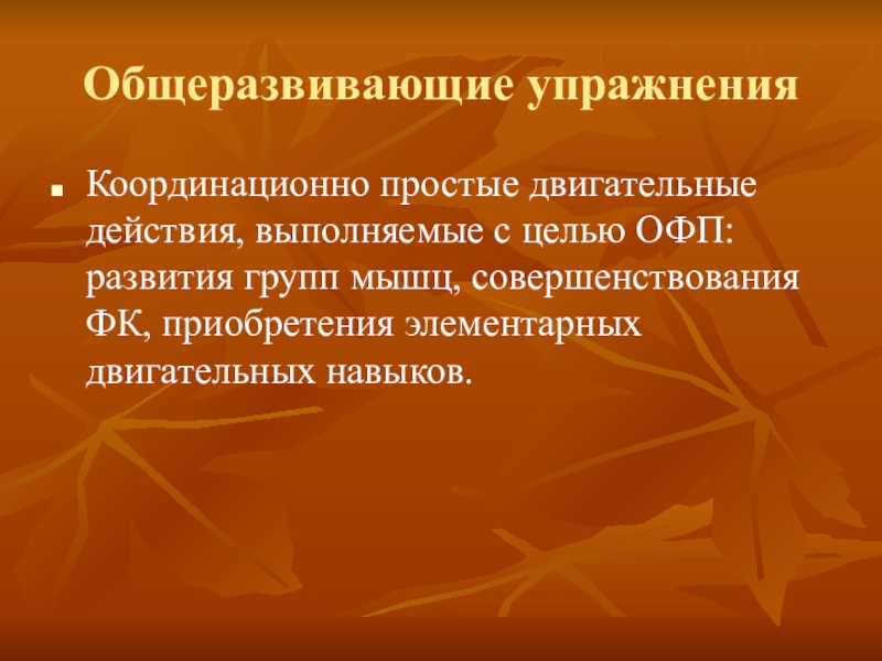 Общеразвивающие упражненияКоординационно простые двигательные действия, выполняемые с целью ОФП: развития групп мышц, совершенствования ФК, приобретения элементарных двигательных