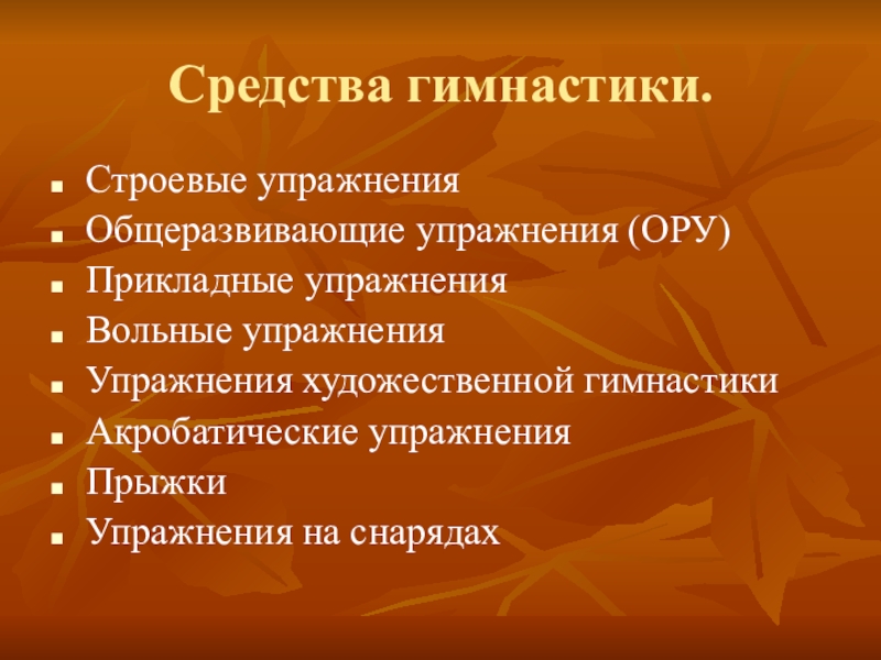 Средства гимнастики.Строевые упражненияОбщеразвивающие упражнения (ОРУ)Прикладные упражненияВольные упражненияУпражнения художественной гимнастикиАкробатические упражненияПрыжкиУпражнения на снарядах