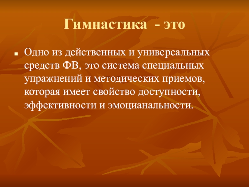 Гимнастика - этоОдно из действенных и универсальных средств ФВ, это система специальных упражнений и методических приемов, которая имеет свойство доступности, эффективности и эмоцианальности.