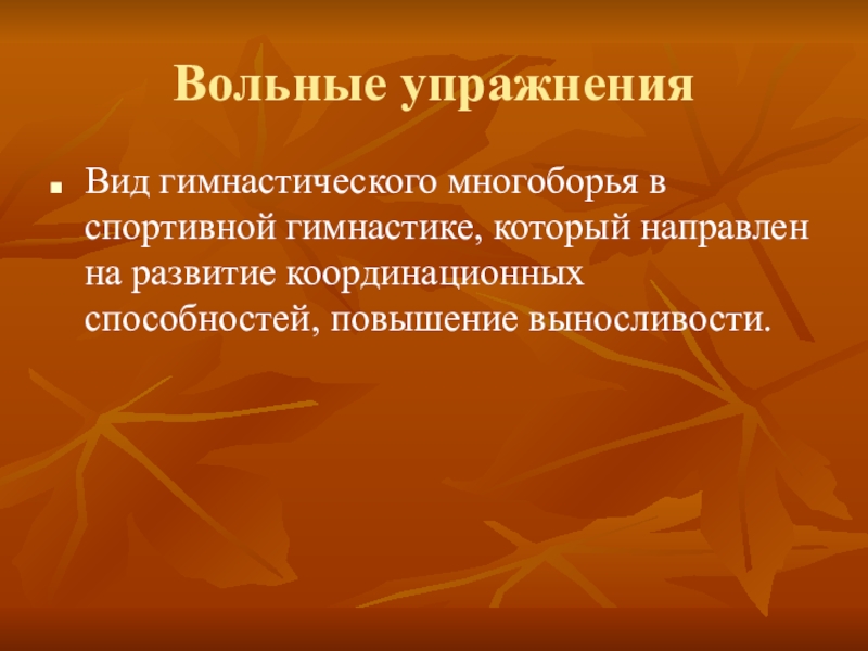 Вольные упражненияВид гимнастического многоборья в спортивной гимнастике, который направлен на развитие координационных способностей, повышение выносливости.