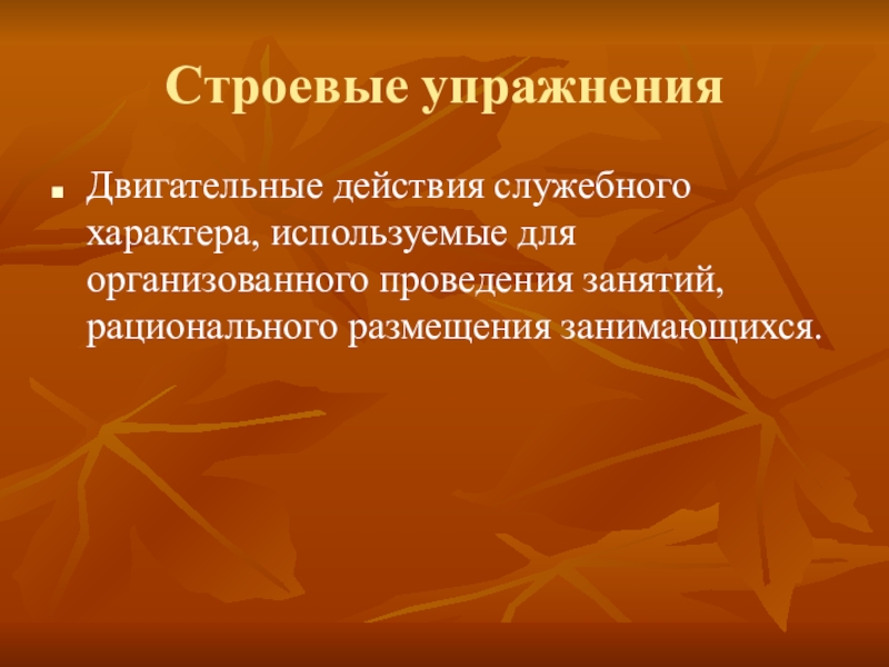 Строевые упражненияДвигательные действия служебного характера, используемые для организованного проведения занятий, рационального размещения занимающихся.