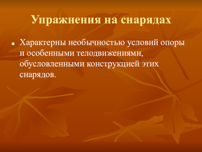 Упражнения на снарядахХарактерны необычностью условий опоры и особенными телодвижениями, обусловленными конструкцией этих снарядов.