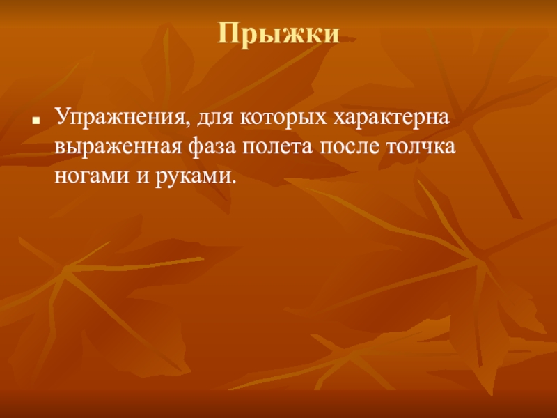 Прыжки Упражнения, для которых характерна выраженная фаза полета после толчка ногами и руками.