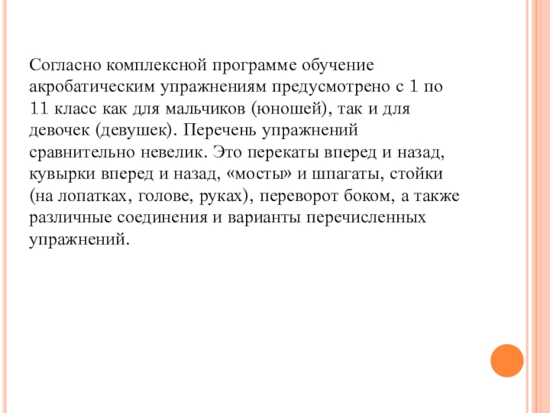 Слайд 5Согласно комплексной программе обучение акробатическим упражнениям предусмотрено с 1 по 11