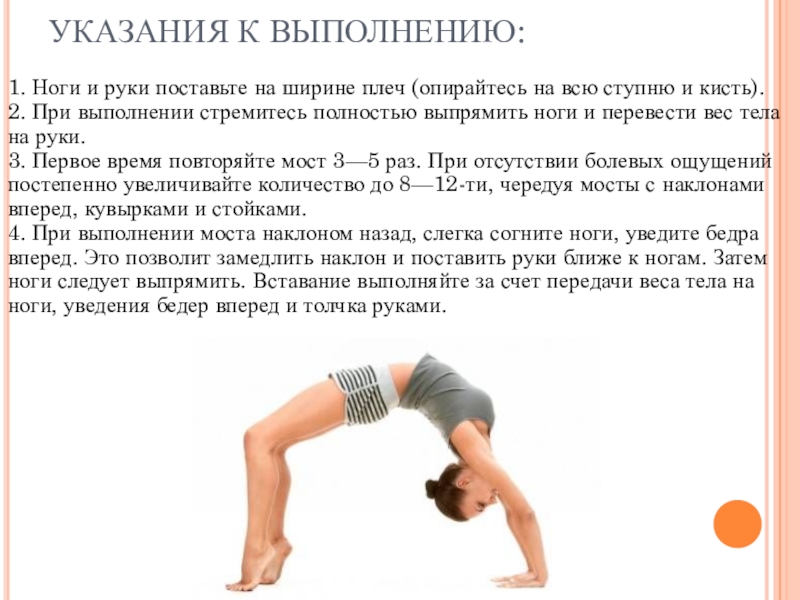 4. При выполнении моста наклоном назад, слегка согните ноги, уведите бедра вперед. Это позволит замедлить наклон и поставить руки ближе к ногам. Затем ноги следует выпрямить. Вставание выполняйте за счет передачи веса тела на ноги, уведения бедер вперед и толчка руками.