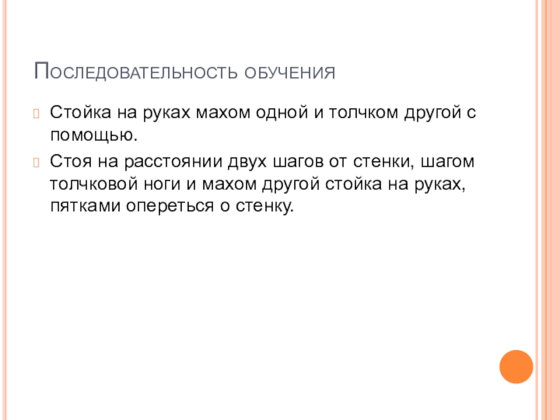 на расстоянии двух шагов от стенки, шагом толчковой ноги и махом другой стойка на руках, пятками опереться о стенку.