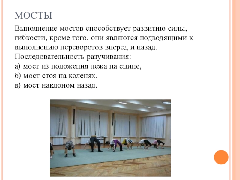 Выполнение мостов способствует развитию силы, гибкости, кроме того, они являются подводящими