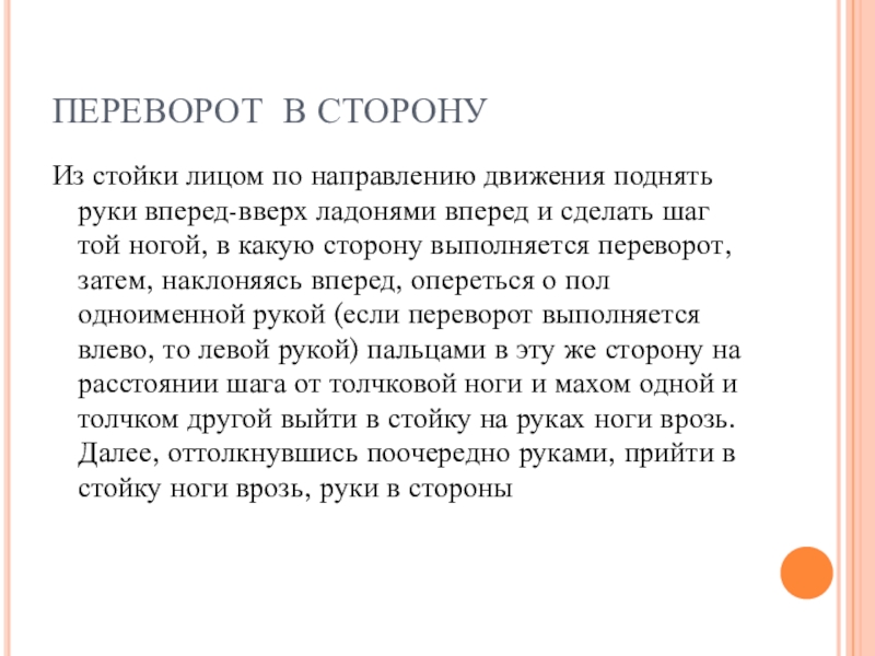 ладонями вперед и сделать шаг той ногой, в какую сторону выполняется переворот, затем, наклоняясь вперед, опереться о пол одноименной рукой (если переворот выполняется влево, то левой рукой) пальцами в эту же сторону на расстоянии шага от толчковой ноги и махом одной и толчком другой выйти в стойку на руках ноги врозь. Далее, оттолкнувшись поочередно руками, прийти в стойку ноги врозь, руки в стороны