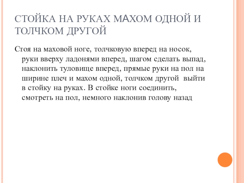 толчковую вперед на носок, руки вверху ладонями вперед, шагом сделать выпад, наклонить туловище вперед, прямые руки на пол на ширине плеч и махом одной, толчком другой выйти в стойку на руках. В стойке ноги соединить, смотреть на пол, немного наклонив голову назад