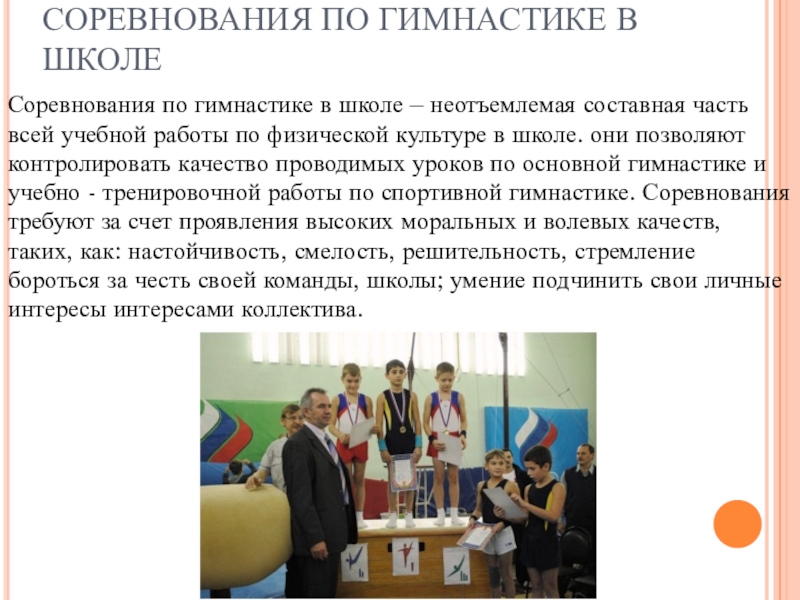составная часть всей учебной работы по физической культуре в школе. они позволяют контролировать качество проводимых уроков по основной гимнастике и учебно - тренировочной работы по спортивной гимнастике. Соревнования требуют за счет проявления высоких моральных и волевых качеств, таких, как: настойчивость, смелость, решительность, стремление бороться за честь своей команды, школы; умение подчинить свои личные интересы интересами коллектива.