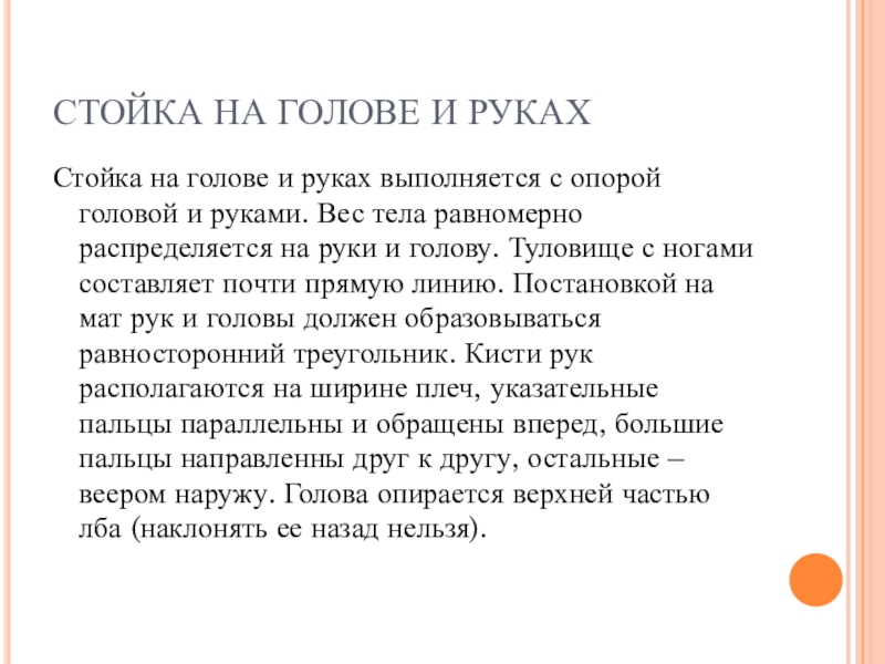 опорой головой и руками. Вес тела равномерно распределяется на руки и голову. Туловище с ногами составляет почти прямую линию. Постановкой на мат рук и головы должен образовываться равносторонний треугольник. Кисти рук располагаются на ширине плеч, указательные пальцы параллельны и обращены вперед, большие пальцы направленны друг к другу, остальные – веером наружу. Голова опирается верхней частью лба (наклонять ее назад нельзя).