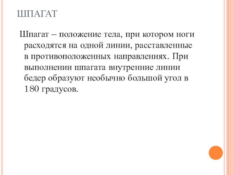 Шпагат – положение тела, при котором ноги расходятся на одной линии,