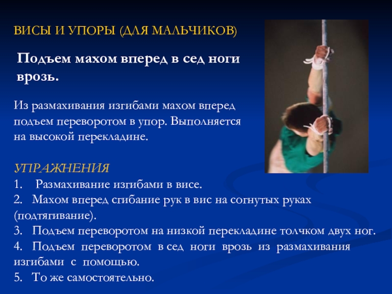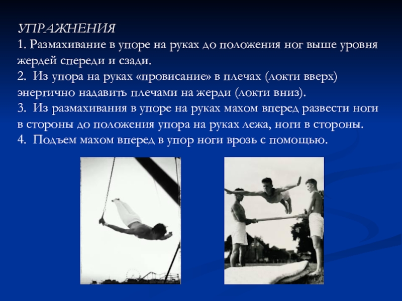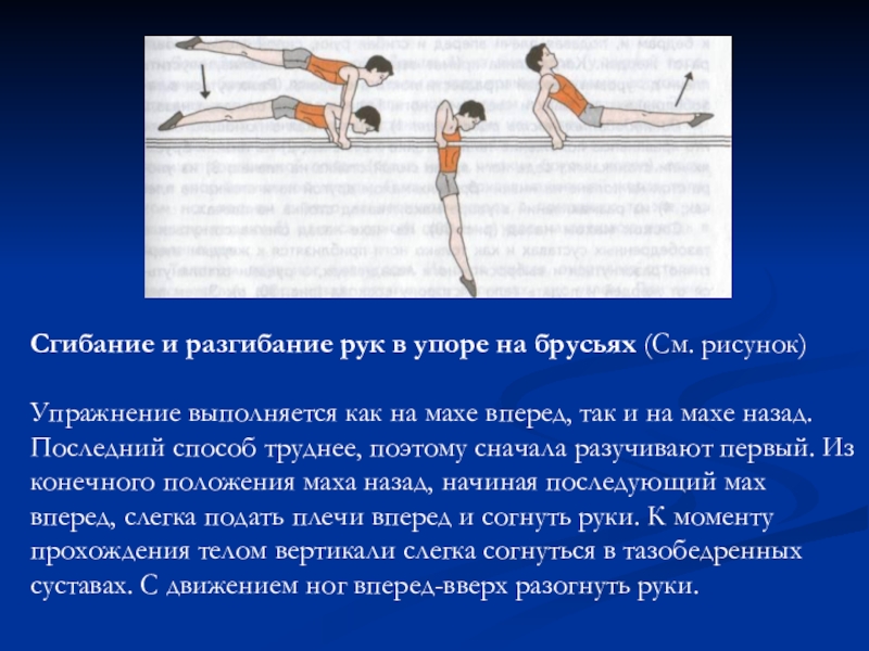 Размахивание в упоре, махом назад развести ноги и мягко опустить на жерди внутренними сторонами стоп, согнуть руки, оттолкнуться ногами, свести их и махом вперед разогнуть руки; сгибание и разгибание рук на махе, с помощью и страховкой.