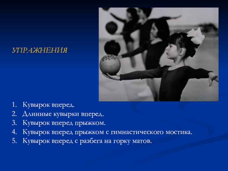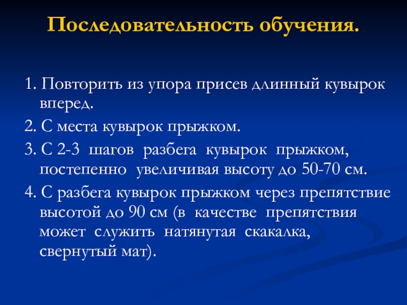3. С 2-3 шагов разбега кувырок прыжком, постепенно увеличивая высоту до 50-70 см.