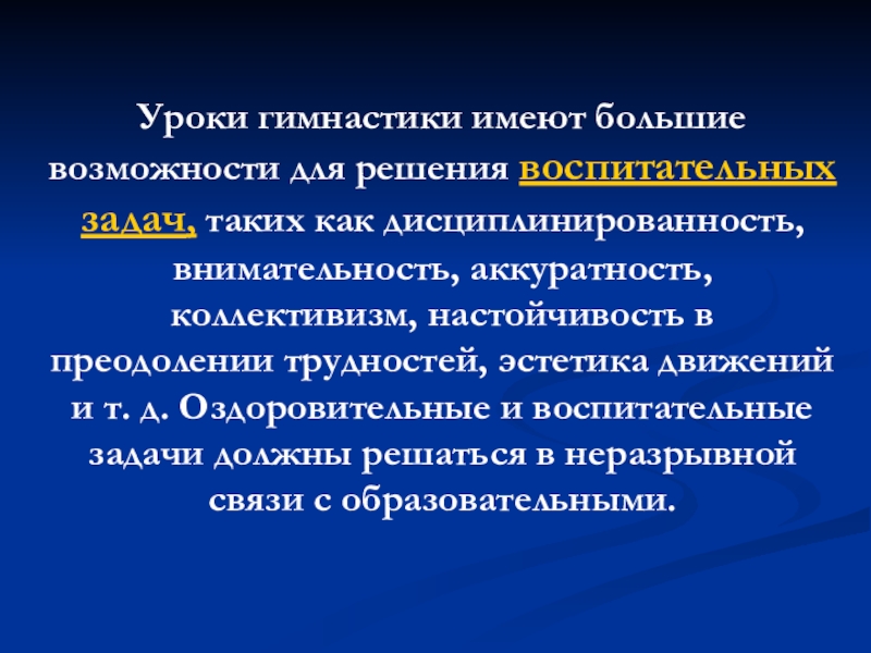 Слайд 11Уроки гимнастики имеют большие возможности для решения воспитательных задач, таких как