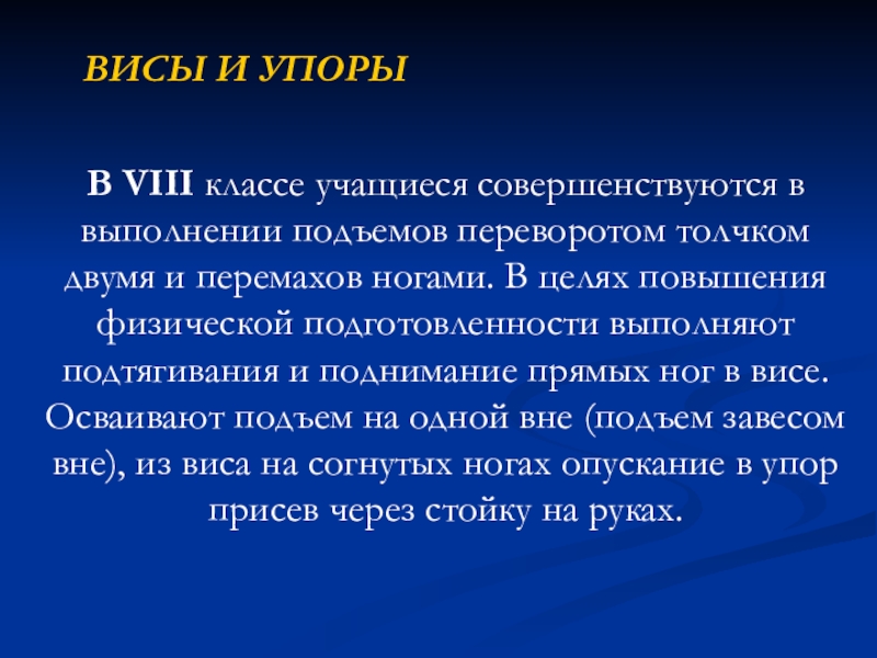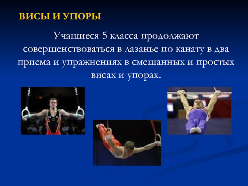 классах, расширяется и углубляется. Более сложными становятся упражнения в построениях и перестроениях, общеразвивающие упражнения без предметов и с предметами (набивными мячами, палками, обручами, скакалками, булавами, лентами), акробатические упражнения, упорные прыжки, упражнения в висах и упорах на различных гимнастических снарядах.