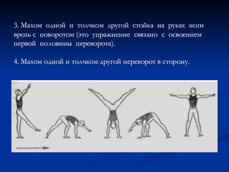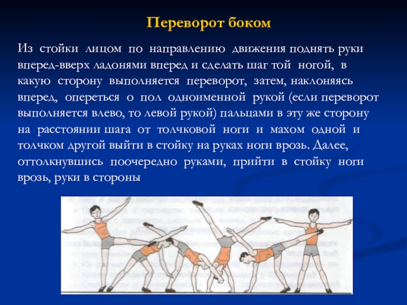 вперед и сделать шаг той ногой, в какую сторону выполняется переворот, затем, наклоняясь вперед, опереться о пол одноименной рукой (если переворот выполняется влево, то левой рукой) пальцами в эту же сторону на расстоянии шага от толчковой ноги и махом одной и