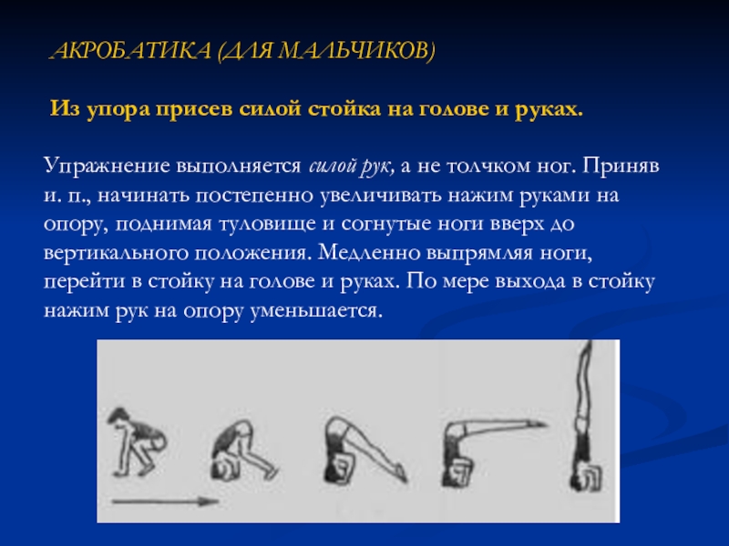 наклонить туловище вперед, поставить прямые руки на пол на ширине плеч и махом одной, толчком другой выйти в стойку на руках. В стойке ноги соединить, смотреть на пол, немного наклонив голову назад.