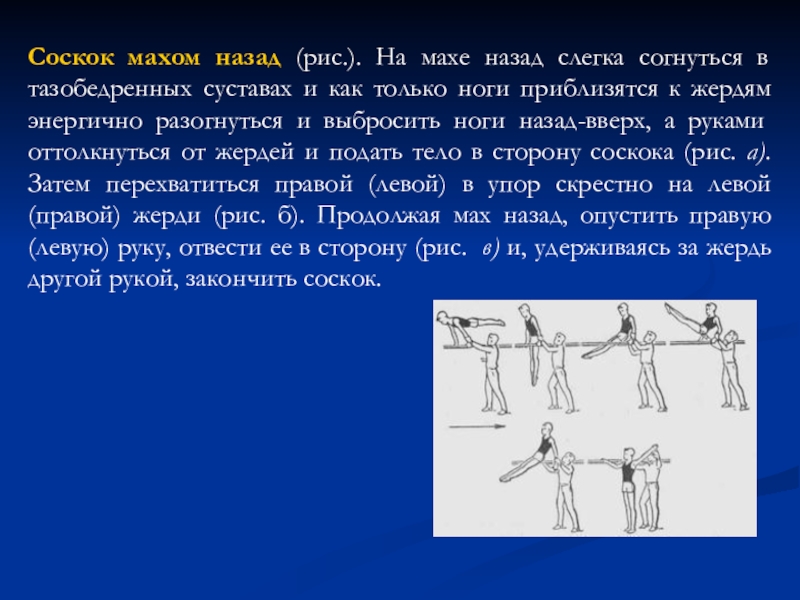 суставах и как только ноги приблизятся к жердям энергично разогнуться и выбросить ноги назад-вверх, а руками оттолкнуться от жердей и подать тело в сторону соскока (рис. а). Затем перехватиться правой (левой) в упор скрестно на левой (правой) жерди (рис. б). Продолжая мах назад, опустить правую (левую) руку, отвести ее в сторону (рис. в) и, удерживаясь за жердь другой рукой, закончить соскок.