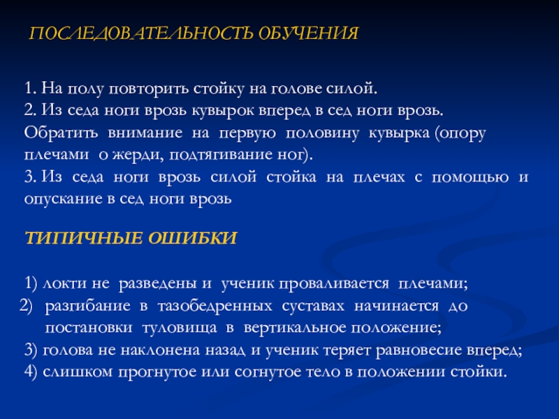 равновесие назад, опереться руками о пол около колен. Сед с прямыми ногами и кувырок назад через стойку на руках с помощью.