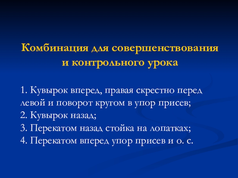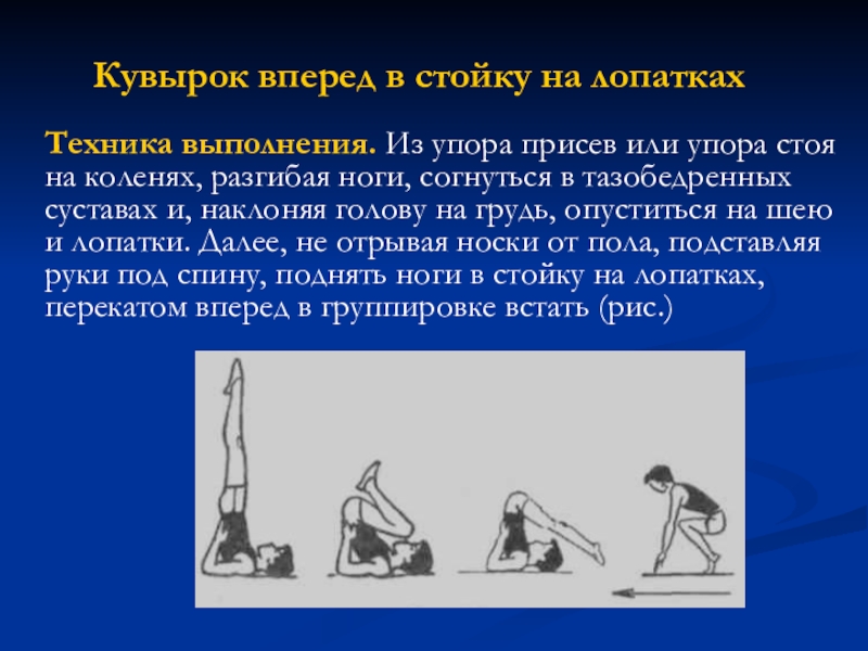 Кувырок выполняется из седа с наклоном вперед или после седа назад с прямыми ногами. Заканчивая перекат назад согнувшись, поставить руки около плеч пальцами к плечам и быстро разогнуться ногами вверх, одновременно активно выпрямляя руки, опуская ноги назад, принять упор присев.