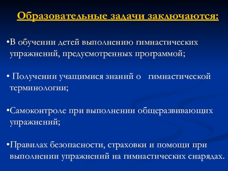 В обучении детей выполнению гимнастических упражнений, предусмотренных программой;