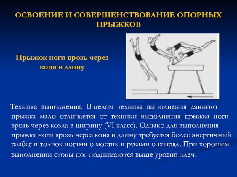 выполнения данного прыжка мало отличается от техники выполнения прыжка ноги врозь через козла в ширину (VI класс). Однако для выполнения прыжка ноги врозь через коня в длину требуется более энергичный разбег и толчок ногами о мостик и руками о снаряд. При хорошем выполнении стопы ног поднимаются выше уровня плеч.