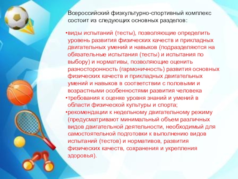 Слайд 15Всероссийский физкультурно-спортивный комплекс состоит из следующих основных разделов: