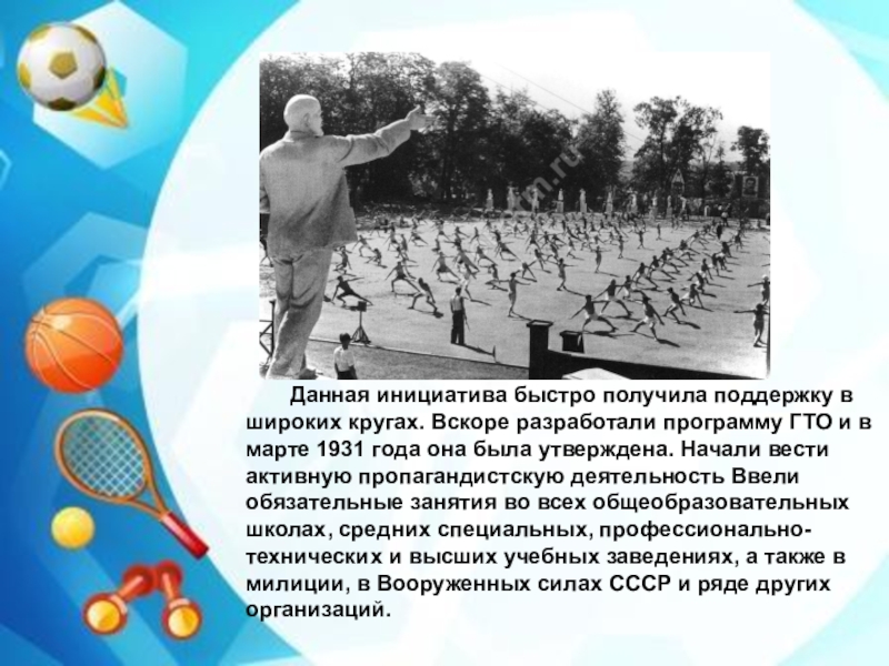 ГТО и в марте 1931 года она была утверждена. Начали вести активную пропагандистскую деятельность Ввели обязательные занятия во всех общеобразовательных школах, средних специальных, профессионально-технических и высших учебных заведениях, а также в милиции, в Вооруженных силах СССР и ряде других организаций.