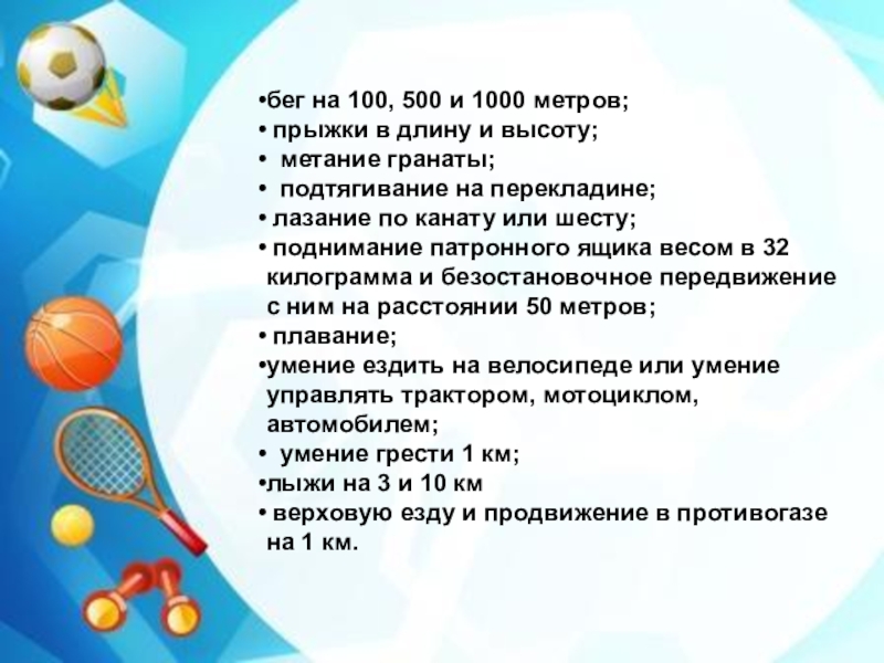 метание гранаты, бег на лыжах на 3-5 километров для мальчиков и 2-3 километра для девочек, ходьба в противогазе;