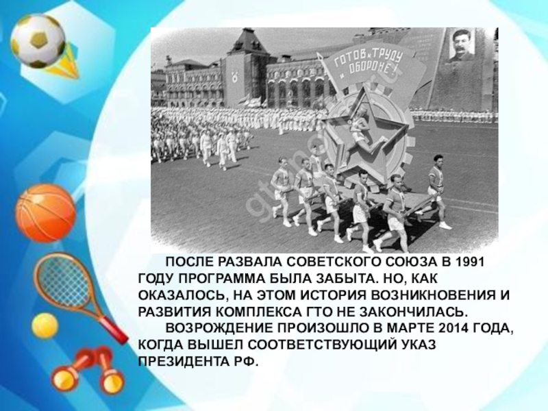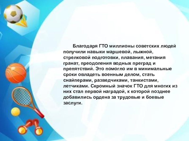 Слайд 12 Благодаря ГТО миллионы советских людей получили навыки маршевой, лыжной, стрелковой подготовки,