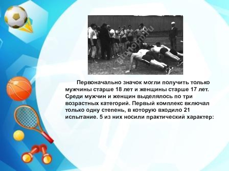 Слайд 6 Первоначально значок могли получить только мужчины старше 18 лет и женщины