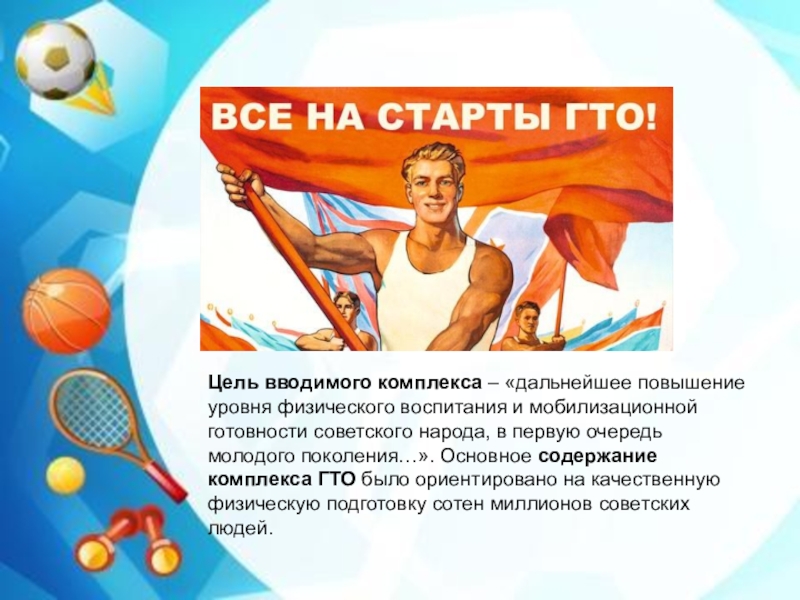 Слайд 5Цель вводимого комплекса – «дальнейшее повышение уровня физического воспитания и мобилизационной