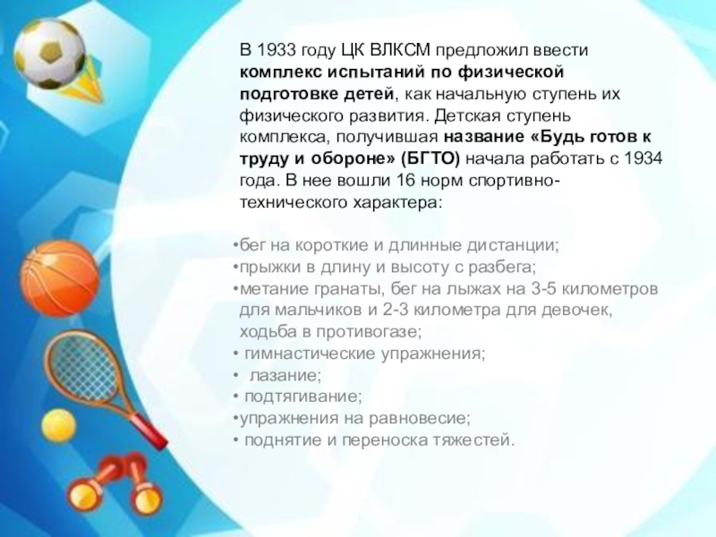 Слайд 10В 1933 году ЦК ВЛКСМ предложил ввести комплекс испытаний по физической
